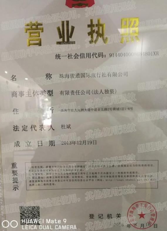 企业全称:珠海骏通国际旅行社有限公司