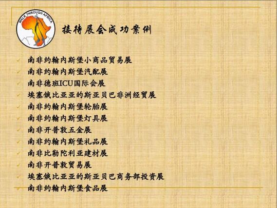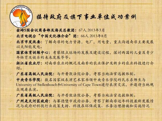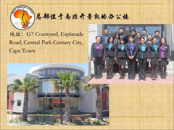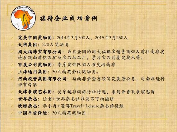 也正是正确的经营理念和人才理念,带来了几年的高速发展。公司成立十年以来,穿越非洲旅行社依靠自身不断的努力和发展,先后成立了有中国外专局境外培训资格的百大国际交流有限公司 Cape lands exchange center,开普敦国际会展有限公司,穿越非洲交通运输公司,穿越非洲商务管理顾问公司等,形成了以服务行业为基础的产业化,集团化链式经营服务体系。