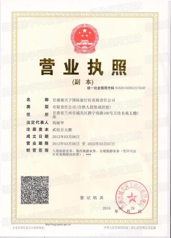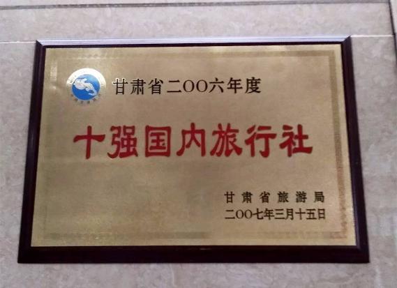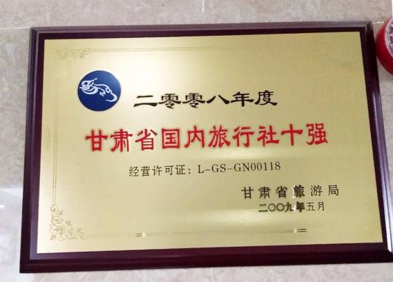 公司自成立以来,多年连续获得国家、省、市级旅游管理部门对公司的嘉奖。连续三年位居甘肃省十强旅行社,同时连续三年被评为青年文明号旅行社,荣获兰州市首批四星级旅行社、甘肃省诚信企业、丝绸之路敦煌旅游飞天奖。并多次成为兰洽会指定旅游接待服务社;经由我公司策划,成功承接“第五届黄河旅游文化节”、“皋兰县梨花节”、“母亲河畔一日走公益活动”等大型活动。