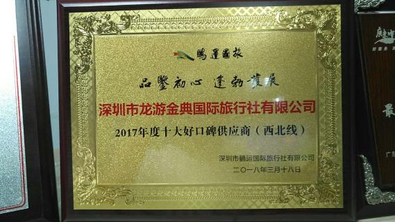 2017年度荣获鹏运国旅颁发的十大好口碑供应商(西北线);